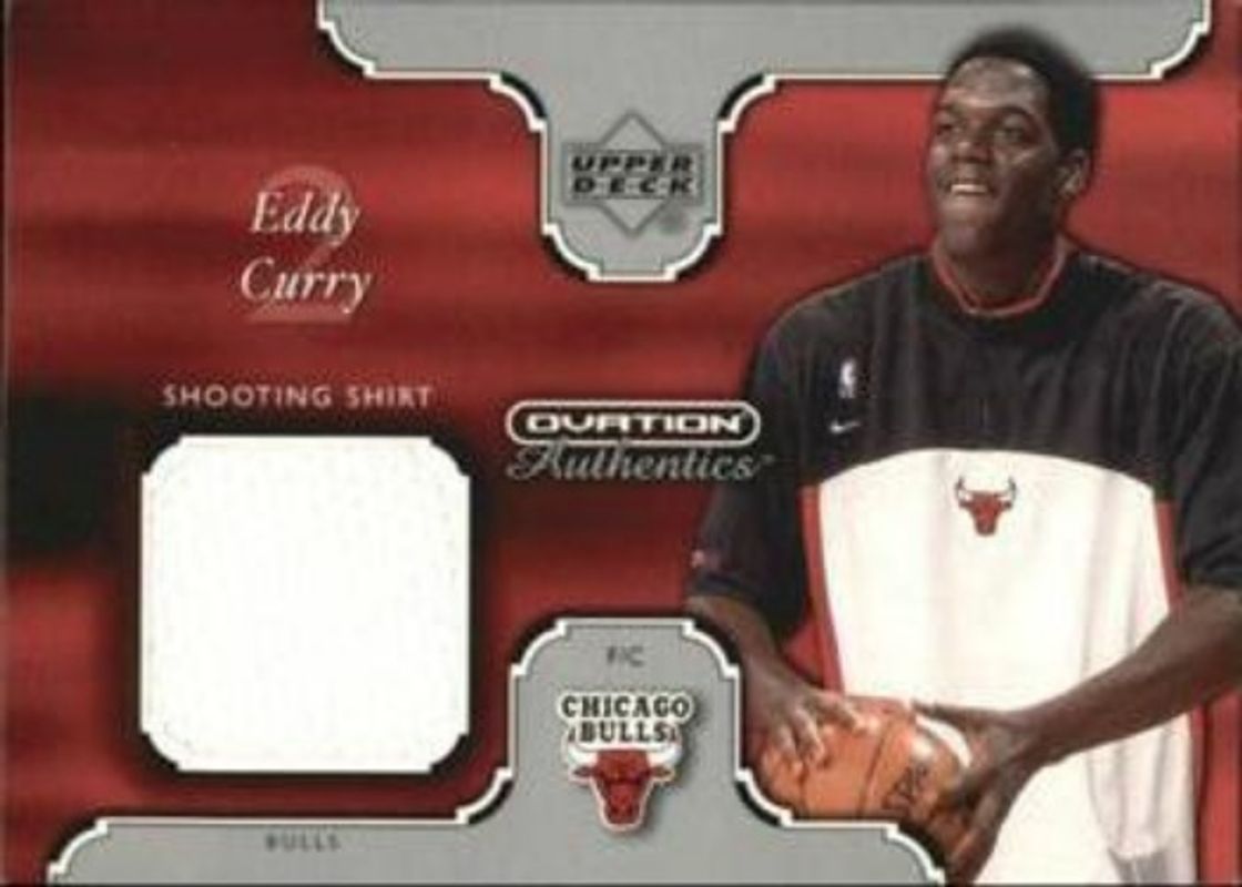 The Eddy Curry 2002 Upper Deck Ovation #EC-S Authentics Shooting Shirt card is 1 of 3 Eddy Curry's card variations in the 2002 Upper Deck Ovation set being tracked by Sports Card Investor, including Base /2999, and Authentics Shooting Shirt Gold /15.