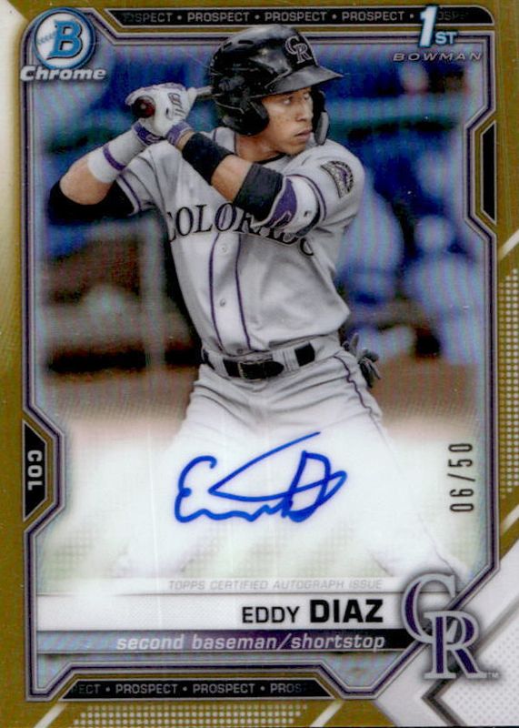 Eddy Diaz's Baseball cards are available in at least 1 sets. Eddy Diaz's biggest 7-day price movers are 2021 Bowman #CPA-ED Chrome Prospect Auto - Gold Refractor /50 (1st), 2021 Bowman #CPA-ED Chrome Prospect Auto - Yellow Refractor /75 (1st), and 2021 Bowman #CPA-ED Chrome Prospect Auto - Speckle Refractor /299 (1st).