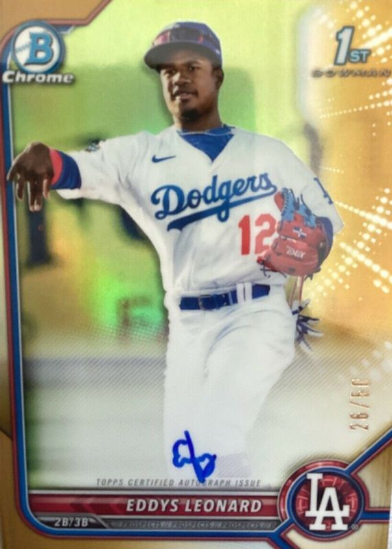 The Eddys Leonard 2022 Bowman #CPA-EL Chrome Prospect Auto - Gold Refractor /50 (1st) card in Raw condition has not changed in price in the last 30 days and was last sold for $15.00 .