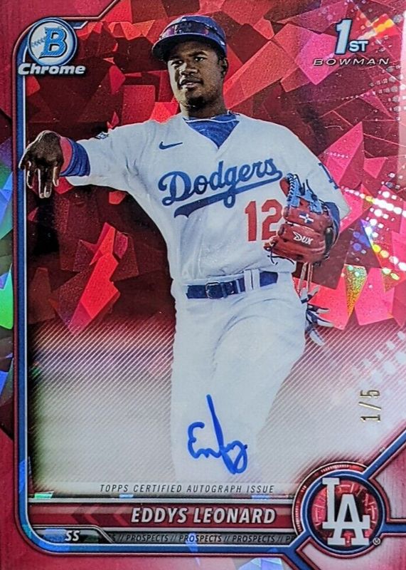 Best Prices Available For Sale of Eddys Leonard 2022 Bowman Sapphire Edition #BSPA-ELD Chrome Prospect Auto - Red /5 (1st)