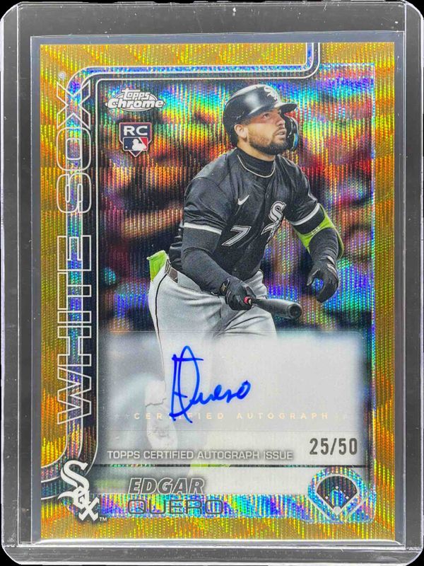 The Edgar Quero 2025 Topps Chrome Update #AC-EQ Autographs - Gold Wave Refractor /50 Rookie card is 1 of 151 Edgar Quero's card variations in the 2025 Topps Chrome Update set being tracked by Sports Card Investor, including #USC165 Base, #USC169 Base, #USC165 Image Variation, #USC165 Geometric Refractor, and #USC169 Geometric Refractor.