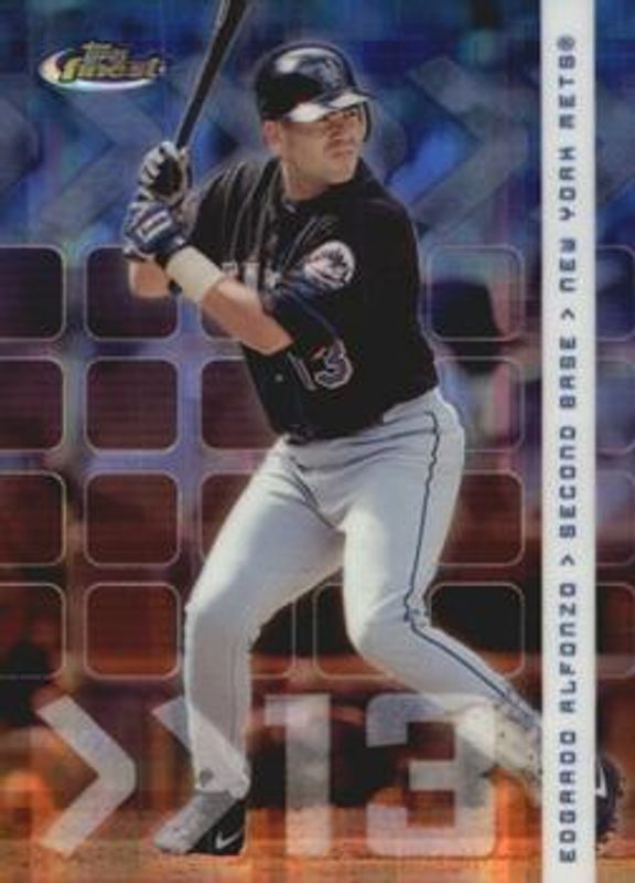 The Edgardo Alfonzo 2002 Topps Finest #51 X-Fractor /299 card is 1 of 3 Edgardo Alfonzo's card variations in the 2002 Topps Finest set being tracked by Sports Card Investor, including Base, and Refractor /499.