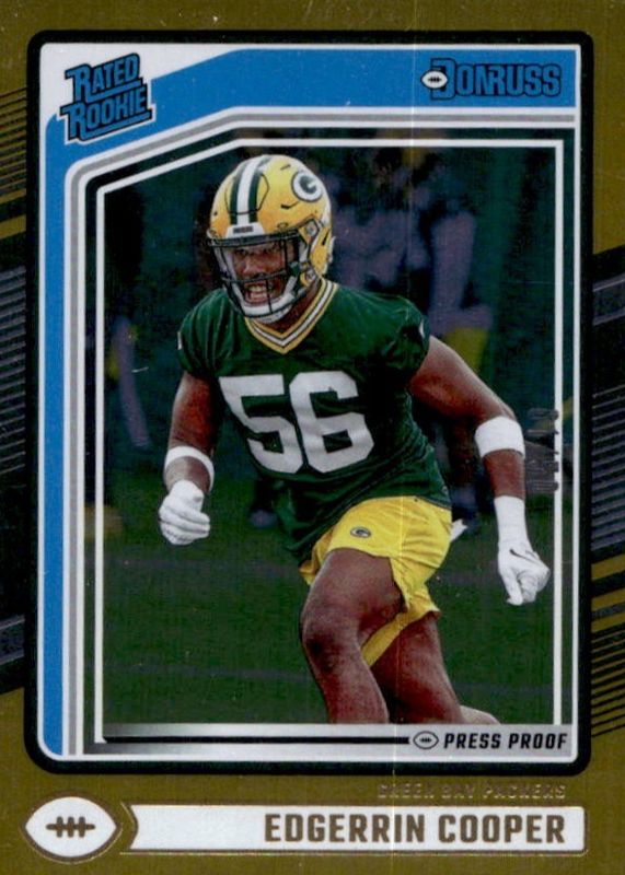 The Edgerrin Cooper 2024 Donruss #325 Press Proof Gold /50 Rookie card in Raw condition has not changed in price in the last 30 days and was last sold for $15.00 .