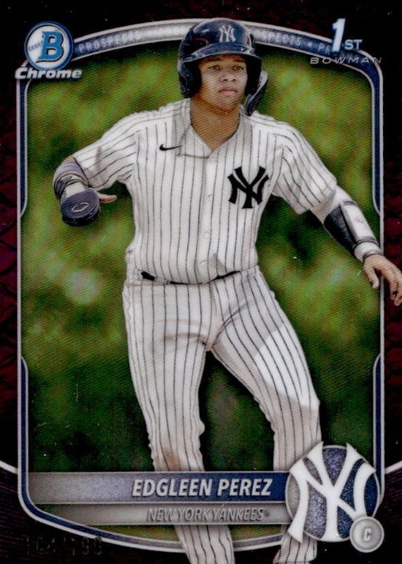 This card is 1 of 88 Edgleen Perez's card variations in the 2025 Bowman set being tracked by Sports Card Investor, including Chrome Prospects (1st), Chrome Prospects - Gumball Refractor (1st), Chrome Prospects - Mini Diamond Refractor (1st), Chrome Prospects - Peanuts Refractor (1st), and Chrome Prospects - Pearl Refractor (1st).