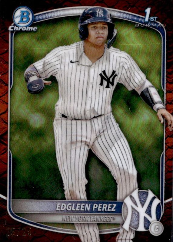 This card is 1 of 88 Edgleen Perez's card variations in the 2025 Bowman set being tracked by Sports Card Investor, including Chrome Prospects (1st), Chrome Prospects - Gumball Refractor (1st), Chrome Prospects - Mini Diamond Refractor (1st), Chrome Prospects - Peanuts Refractor (1st), and Chrome Prospects - Pearl Refractor (1st).