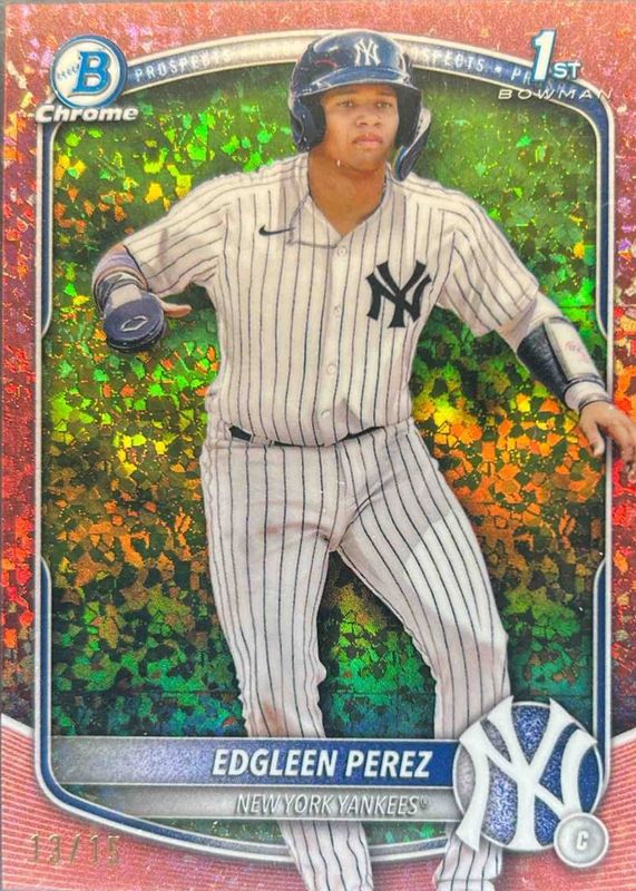 This card is 1 of 88 Edgleen Perez's card variations in the 2025 Bowman set being tracked by Sports Card Investor, including Chrome Prospects (1st), Chrome Prospects - Gumball Refractor (1st), Chrome Prospects - Mini Diamond Refractor (1st), Chrome Prospects - Peanuts Refractor (1st), and Chrome Prospects - Pearl Refractor (1st).