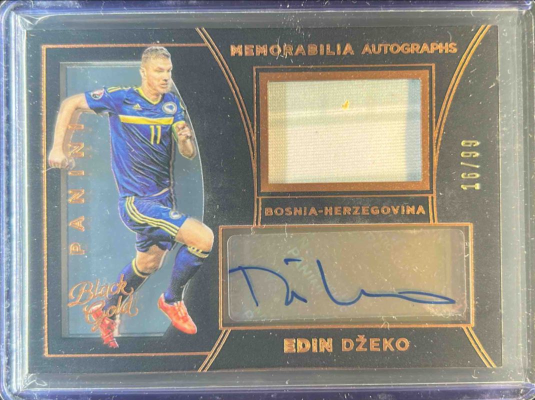 The Edin Dzeko 2016 Black Gold #MA-ED Memorabilia Autographs - Bronze /35 card is 1 of 11 Edin Dzeko's card variations in the 2016 Black Gold set being tracked by Sports Card Investor, including Autographs, Memorabilia Autographs, Gilded Signatures /199, Autographs - Bronze /99, and Autographs Holo - Gold /25.