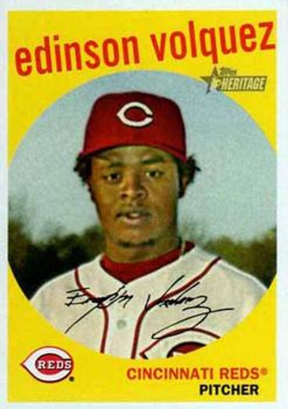 The Edinson Volquez 2008 Topps Heritage #540 Base Rookie card is 1 of 4 Edinson Volquez's card variations in the 2008 Topps Heritage set being tracked by Sports Card Investor, including Chrome /1959, Chrome Refractor /559, and Chrome Refractor Black /59.
