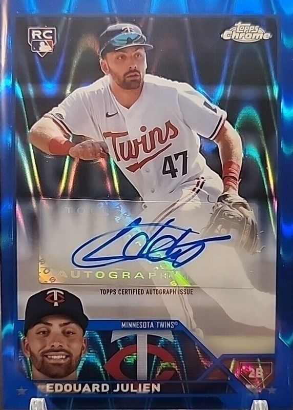 The Edouard Julien 2023 Topps Chrome Update #AC-EJU Autographs - Blue RayWave Refractor /150 Rookie card in Raw condition has not changed in price in the last 30 days and was last sold for $11.50 .
