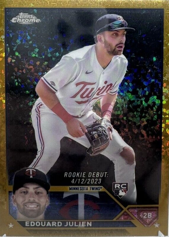 The Edouard Julien 2023 Topps Chrome Update #USC141 Rookie Debut - Gold Mini-Diamond Refractor /50 card in Raw condition has not changed in price in the last 30 days and was last sold for $7.99 .