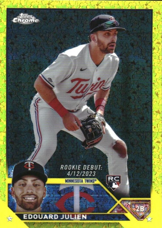 The Edouard Julien 2023 Topps Chrome Update #USC141 Rookie Debut - Yellow Mini-Diamond Refractor /75 card in Raw condition has not changed in price in the last 30 days and was last sold for $7.99 .