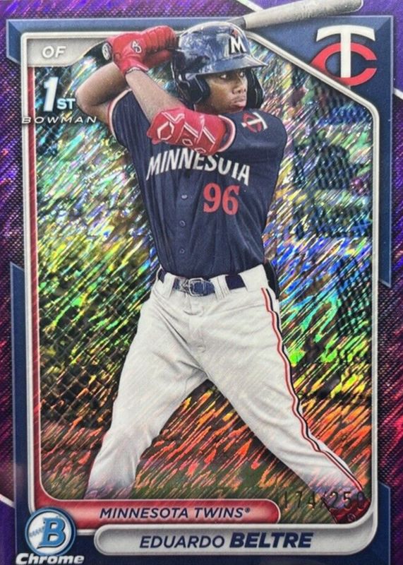 The Eduardo Beltre 2024 Bowman Chrome #BCP-170 Prospects - Purple Shimmer Refractor /250 (1st) card in Raw condition has not changed in price in the last 30 days and was last sold for $0.99 .