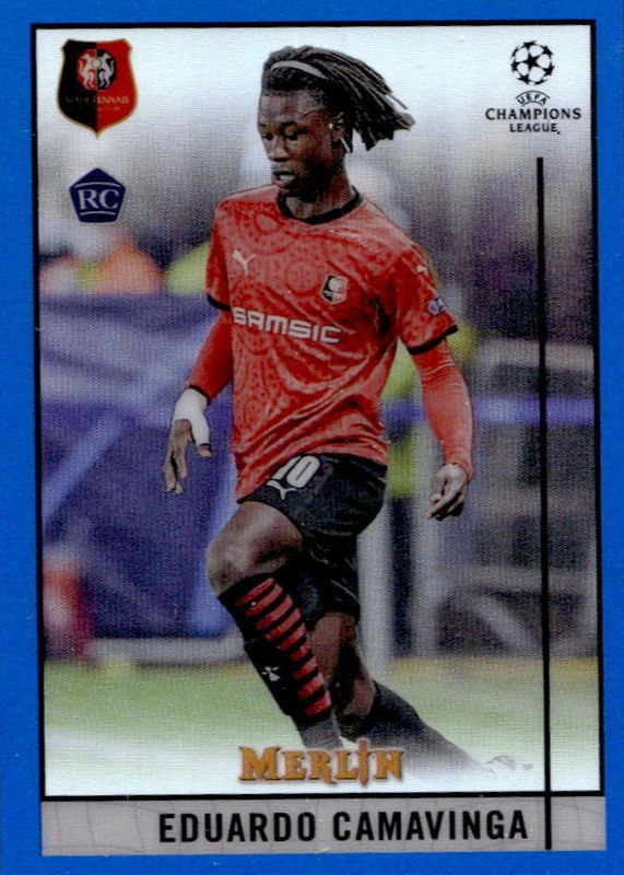 Best Prices Available For Sale of Eduardo Camavinga 2020 Topps Merlin Chrome UEFA Champions League #20 Blue Refractor /75