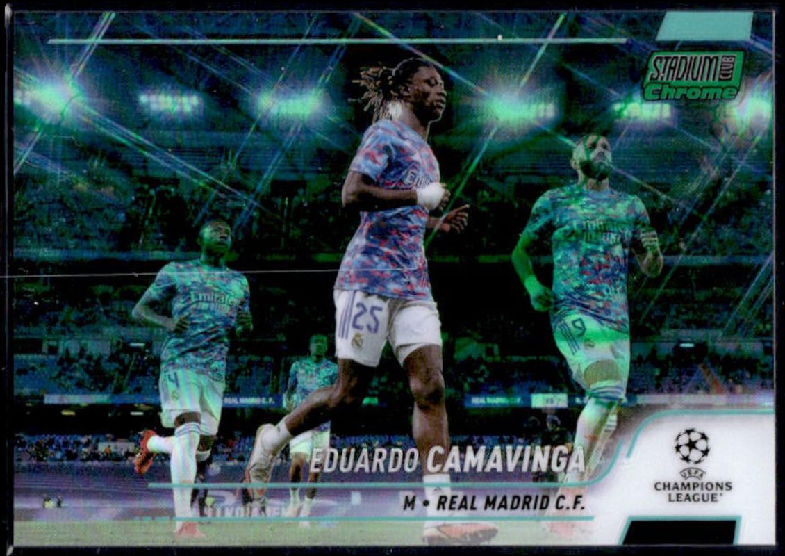 The Eduardo Camavinga 2021 Topps Stadium Club Chrome UEFA Champions League #89 Aqua Green Electric Charge Refractor /199 card is 1 of 42 Eduardo Camavinga's card variations in the 2021 Topps Stadium Club Chrome UEFA Champions League set being tracked by Sports Card Investor, including Base, Blue Prism Refractor, Pink Red Electric Charge Refractor, Refractor, and Black & White Refractor /299.
