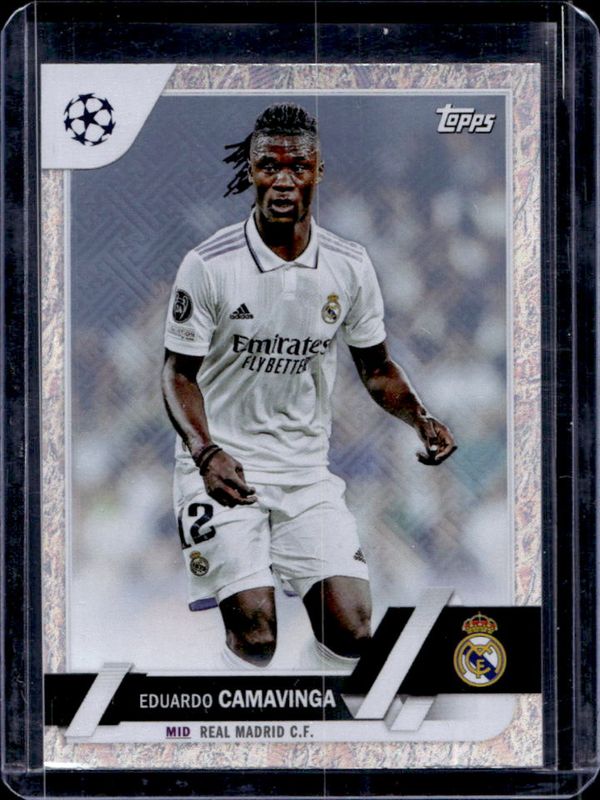 The Eduardo Camavinga 2022 Topps Museum Collection UEFA Champions League #12 Amethyst /99 card is 1 of 18 Eduardo Camavinga's card variations in the 2022 Topps Museum Collection UEFA Champions League set being tracked by Sports Card Investor, including Base, Copper /125, Sapphire /75, Gold /50, and Ruby /25.