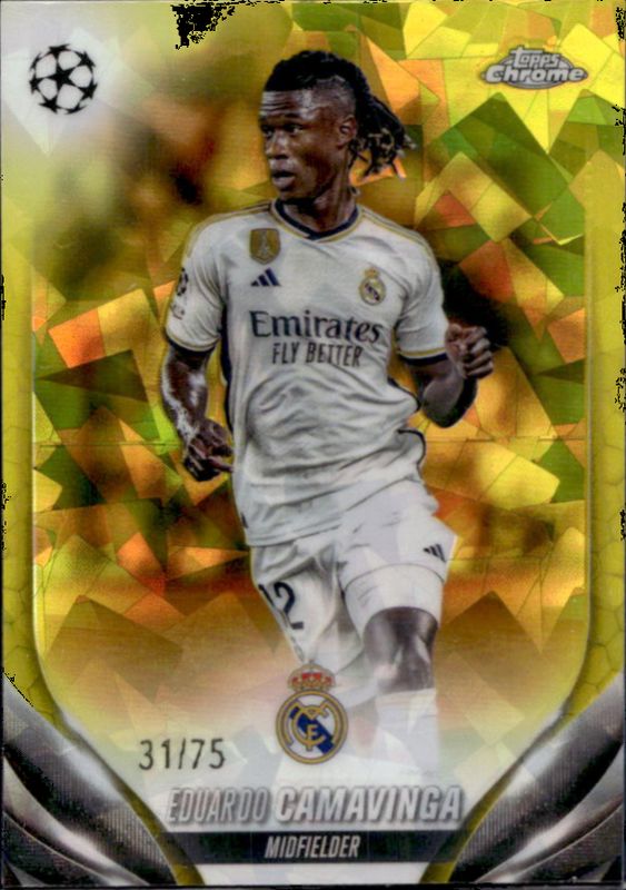 The Eduardo Camavinga 2023 Topps Chrome UEFA Club Competitions Sapphire Edition #36 Yellow /75 card is 1 of 13 Eduardo Camavinga's card variations in the 2023 Topps Chrome UEFA Club Competitions Sapphire Edition set being tracked by Sports Card Investor, including Base, Gold /50, Orange /25, Black /10, and Red /5.