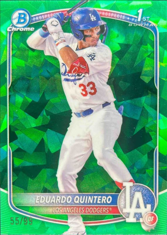 The Eduardo Quintero 2025 Bowman Sapphire Edition #BCP-115 Chrome Prospects - Green Refractor /99 card is 1 of 14 Eduardo Quintero's card variations in the 2025 Bowman Sapphire Edition set being tracked by Sports Card Investor, including Chrome Prospects, Sapphire Selections, Chrome Prospects - Yellow Refractor /75, Chrome Prospects - Gold Refractor /50, and Sapphire Selections - Gold Refractor /50.