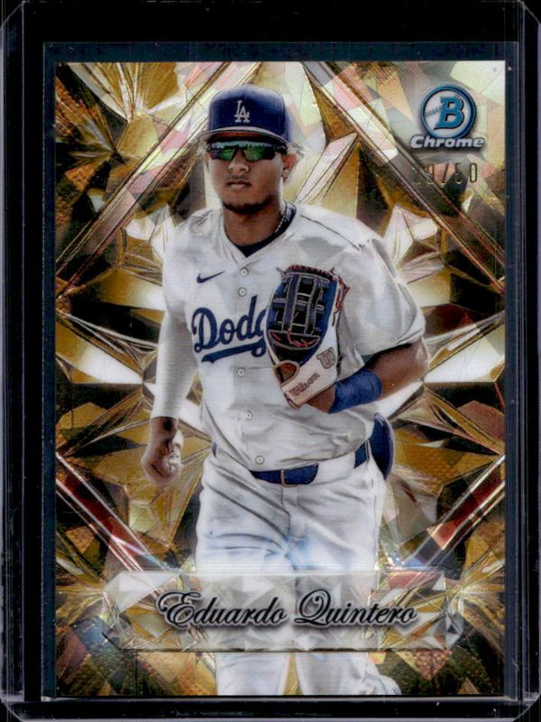 The Eduardo Quintero 2025 Bowman Sapphire Edition #BSS-8 Sapphire Selections - Gold Refractor /50 card is 1 of 14 Eduardo Quintero's card variations in the 2025 Bowman Sapphire Edition set being tracked by Sports Card Investor, including Chrome Prospects, Sapphire Selections, Chrome Prospects - Green Refractor /99, Chrome Prospects - Yellow Refractor /75, and Chrome Prospects - Gold Refractor /50.