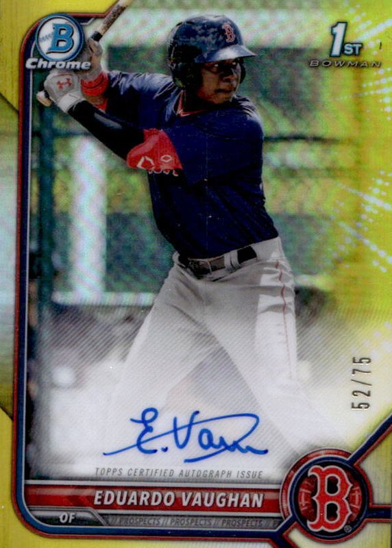 The Eduardo Vaughan 2022 Bowman #CPA-EV Chrome Prospect Auto - Yellow Refractor /75 (1st) card in Raw condition has not changed in price in the last 30 days and was last sold for $69.99 .