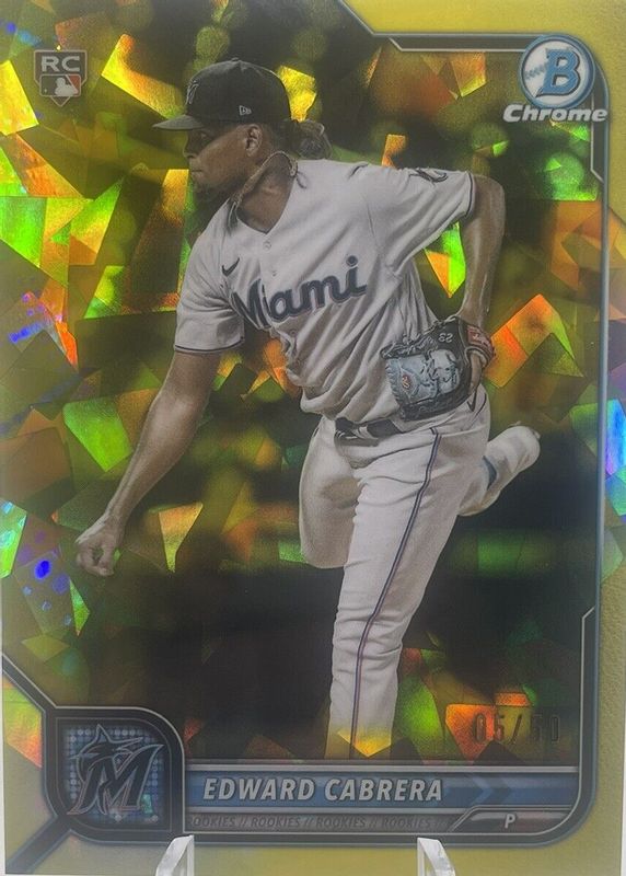 The Edward Cabrera 2022 Topps Chrome Sapphire Edition #566 Gold /50 Rookie card in Raw condition has not changed in price in the last 30 days and was last sold for $7.99 .
