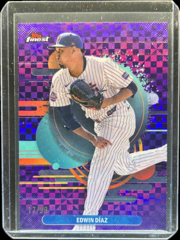 The Edwin Diaz 2025 Topps Finest #149 Base Uncommon - Purple X-Fractor /99 card is 1 of 17 Edwin Diaz's card variations in the 2025 Topps Finest set being tracked by Sports Card Investor, including Base Uncommon, Base Uncommon - Oil Spill Refractor, Base Uncommon - Refractor, Base Uncommon - X-Fractor, and Base Uncommon - Magenta Refractor /300.