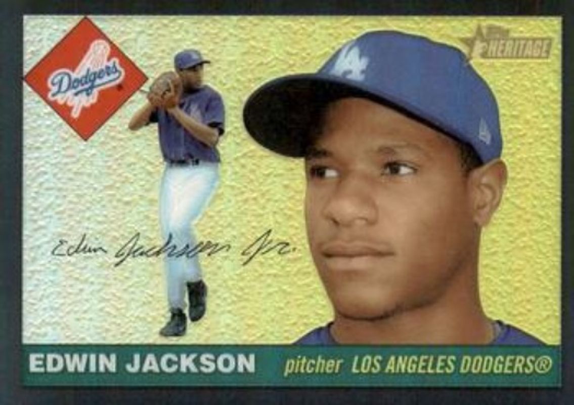 The Edwin Jackson 2004 Topps Heritage #THC70 Chrome Black Refractor /55 Rookie card is 1 of 4 Edwin Jackson's card variations in the 2004 Topps Heritage set being tracked by Sports Card Investor, including Base, Chrome /1955, and Chrome Refractor /555.