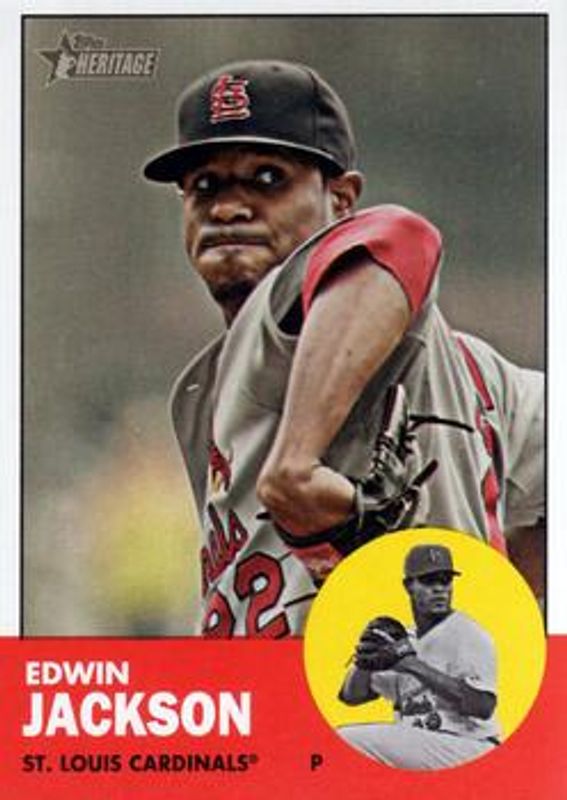 The Edwin Jackson 2012 Topps Heritage #22 Base card is 1 of 3 Edwin Jackson's card variations in the 2012 Topps Heritage set being tracked by Sports Card Investor, including Base, and Target Red Border.