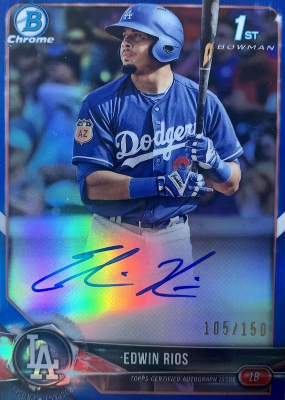 The Edwin Rios 2018 Bowman Chrome #BCPA-ER Prospect Auto - Blue Refractor /150 (1st) card in Raw condition has not changed in price in the last 30 days and was last sold for $9.95 .