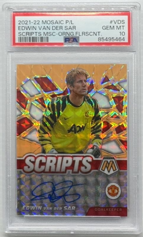 The Edwin Van Der Sar 2021 Mosaic Premier League #SM-VDS Scripts - Orange Fluorescent /50 card is 1 of 10 Edwin Van Der Sar's card variations in the 2021 Mosaic Premier League set being tracked by Sports Card Investor, including Overdrive, Scripts, Scripts Choice Fusion - Red, Scripts - Gold Fluorescent /25, and Scripts - Gold /10.