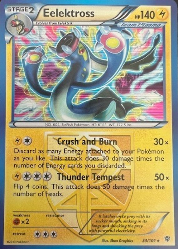 The Eelektross 2013 Black & White: Plasma Blast #033/101 Holo card in Raw TCG (Near Mint) condition has moved up $0.78 (+64.1%) in the last 30 days and was last sold for $2.01 .