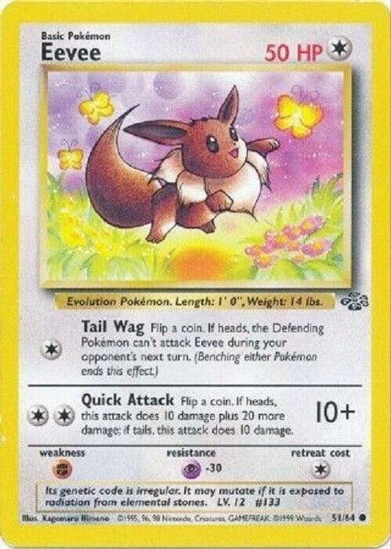 The Eevee 1999 Jungle #51/64 Unlimited card in Raw TCG (Near Mint) condition has moved down -$3.70 (-61.8%) in the last 30 days and was last sold for $2.29 .
