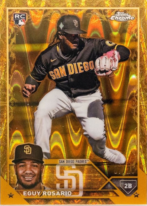 This card is 1 of 12 Eguy Rosario's card variations in the 2023 Topps Gilded Collection set being tracked by Sports Card Investor, including Base /99, Wave Gold Etch Refractor /75, Mini-Diamond Gold Etch Refractor /50, Lava Gold Etch Refractor /10, and Superfractor /1.
