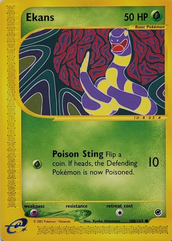 The Ekans 2002 Expedition #108/165 Base card in Raw TCG (Near Mint) condition has not changed in price in the last 30 days and was last sold for $3.50 .