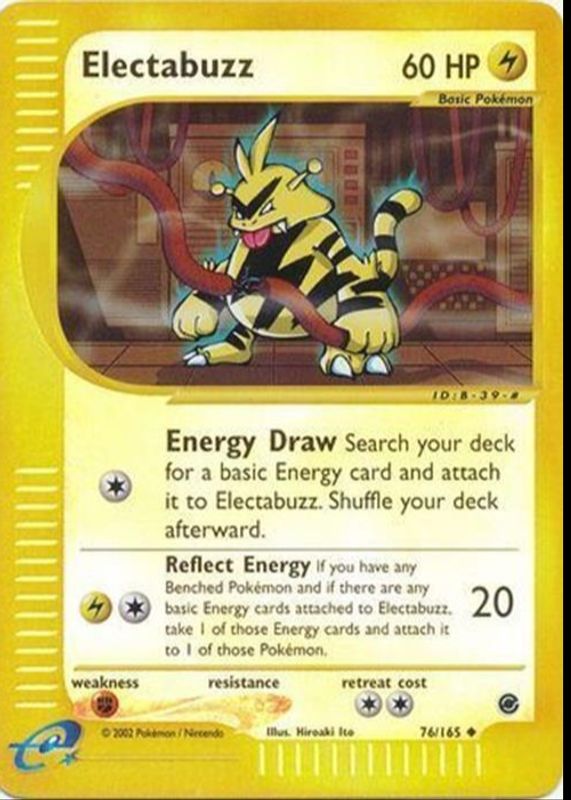 The Electabuzz 2002 Expedition #076/165 Reverse Holo card in Raw TCG (Near Mint) condition has not changed in price in the last 30 days and was last sold for $17.84 .