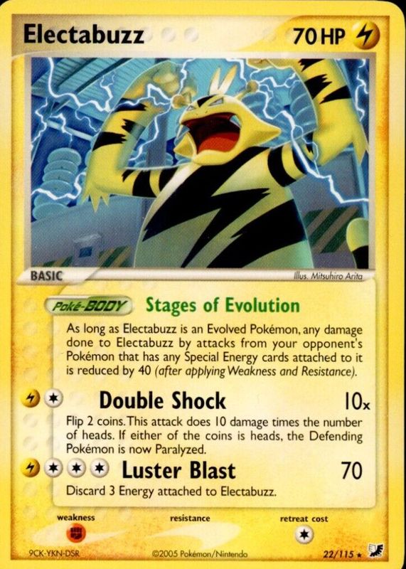 The Electabuzz 2005 EX: Unseen Forces #022/115 Base card in Raw TCG (Near Mint) condition has moved up $1.00 (+33.4%) in the last 30 days and was last sold for $3.99 .