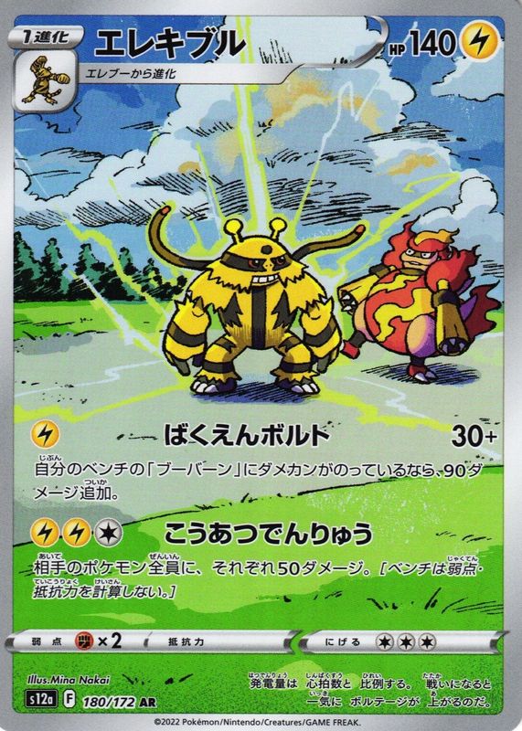 Electivire's Pokemon cards are available in at least 17 sets. Electivire's biggest 7-day price movers are 2022 Japanese Sword & Shield: VSTAR Universe #180/172 Art Rare, 2012 Black & White: Boundaries Crossed #054/149 Holo, and 2010 HeartGold & SoulSilver: Triumphant #020/102 Promo (Prerelease - STAFF).