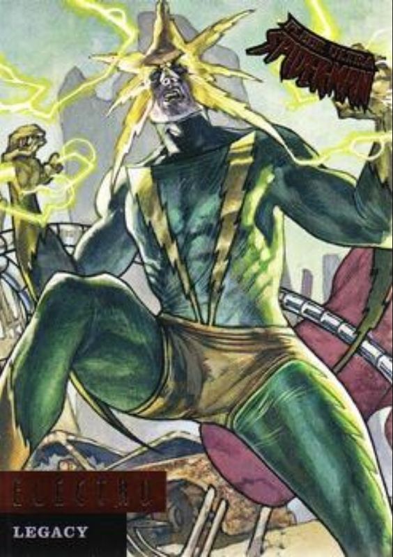 The Electro 2017 Fleer Ultra Spider-Man #L8 Legacy card is 1 of 36 Electro's card variations in the 2017 Fleer Ultra Spider-Man set being tracked by Sports Card Investor, including Base, Silver Web Foil, Gold Web Foil Autographs /49, Printing Plate Black /1, and Printing Plate Cyan /1.