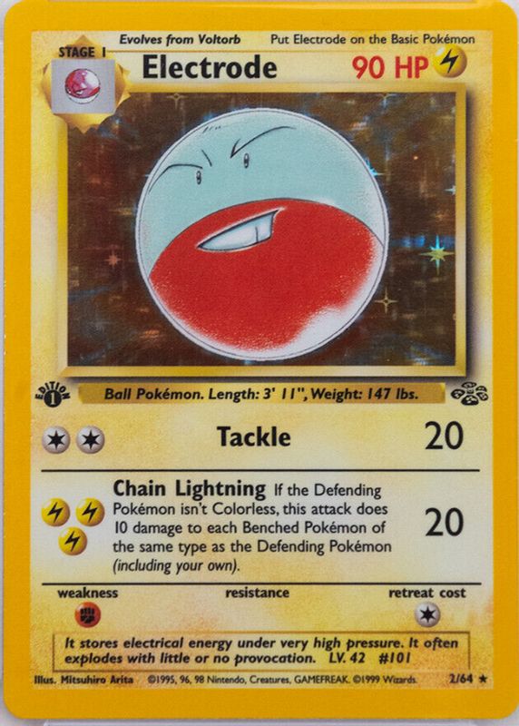 Electrode's Pokemon cards are available in at least 36 sets. Electrode's biggest 7-day price movers are 2023 Scarlet & Violet: 151 #101/165 Reverse Holo, 1999 Jungle #02/64 1st Edition Holo, and 1999 Jungle #18/64 1st Edition.