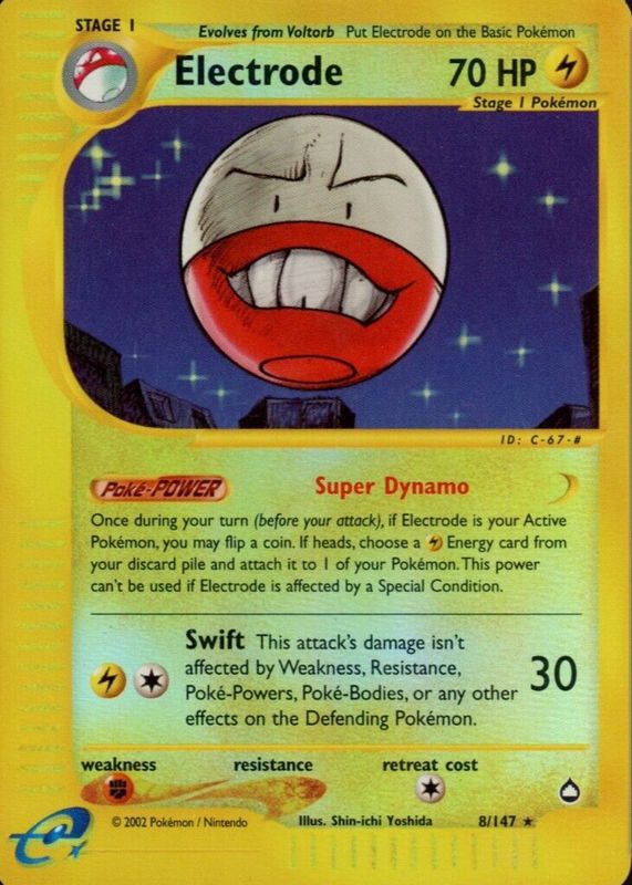 The Electrode 2003 Aquapolis #008/147 Reverse Holo card in Raw TCG (Near Mint) condition has not changed in price in the last 30 days and was last sold for $47.02 .