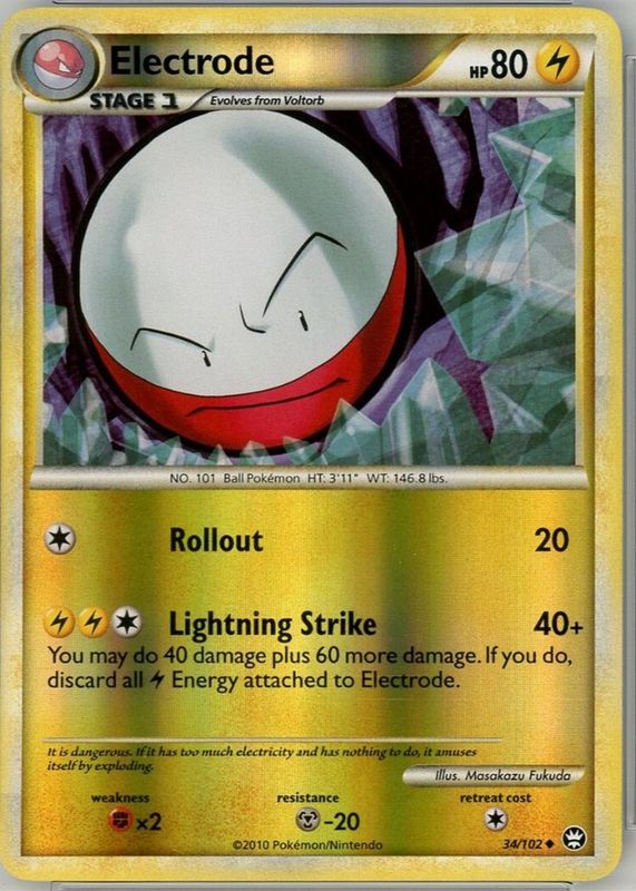 The Electrode 2010 HeartGold & SoulSilver: Triumphant #034/102 Reverse Holo card in Raw TCG (Lightly Played) condition has moved up $2.11 (+213%) in the last 30 days and was last sold for $3.10 .