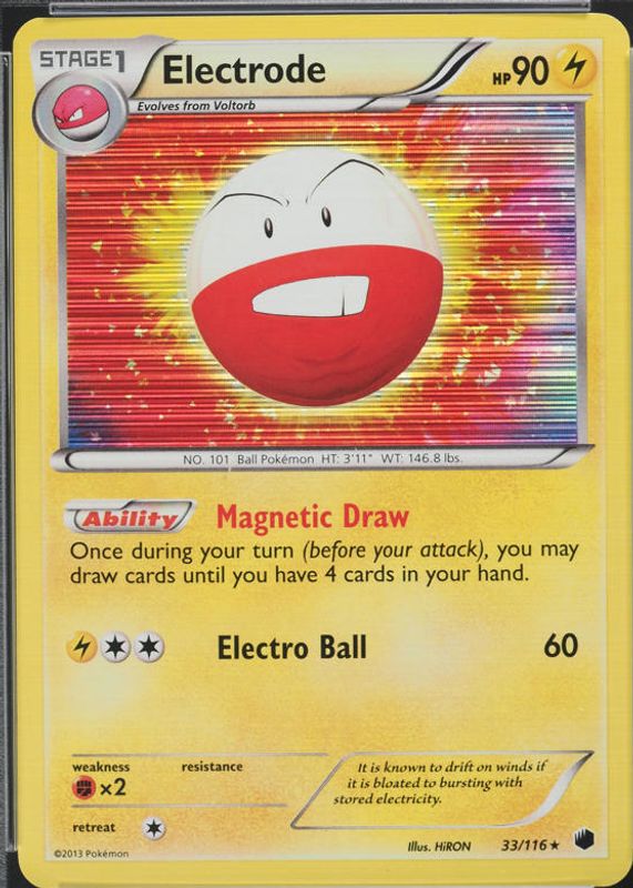 The Electrode 2013 Black & White: Plasma Freeze #033/116 Holo card in Raw TCG (Lightly Played) condition has moved up $0.05 (+1.7%) in the last 30 days and was last sold for $3.00 .