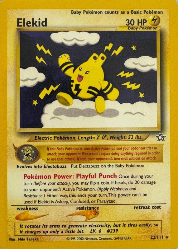 The Elekid 2000 Neo Genesis #22/111 Unlimited card in Raw TCG (Lightly Played) condition has moved down -$0.10 (-3.3%) in the last 30 days and was last sold for $2.89 .