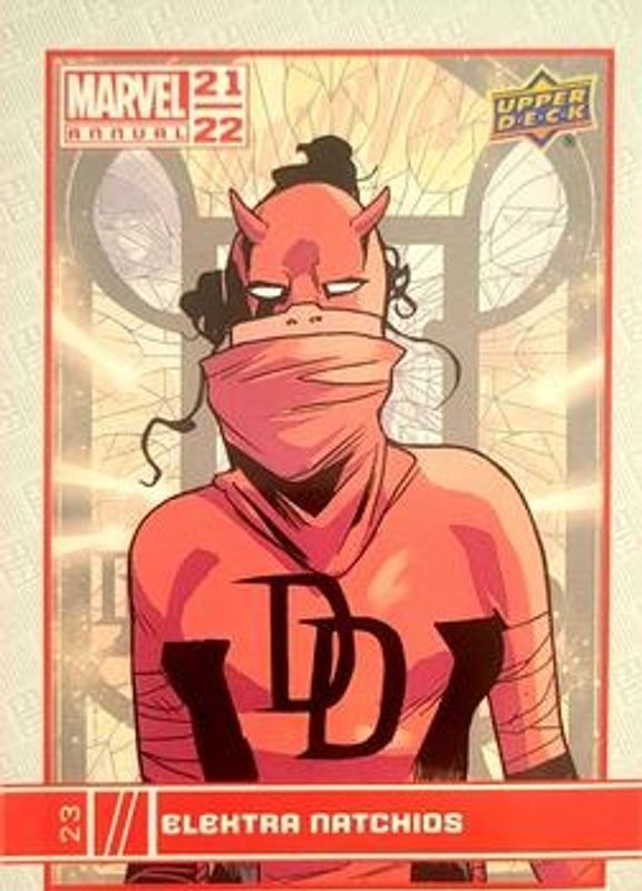The Elektra 2021 Upper Deck Marvel Annual #23 Base card is 1 of 15 Elektra's card variations in the 2021 Upper Deck Marvel Annual set being tracked by Sports Card Investor, including Blue, Canvas Variant, Green, Magenta, and Red.