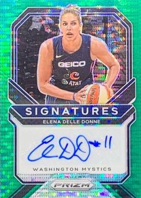 The Elena Delle Donne 2021 Prizm WNBA #SG-EDD Signatures - Green Pulsar /25 card is 1 of 72 Elena Delle Donne's card variations in the 2021 Prizm WNBA set being tracked by Sports Card Investor, including Base, Green, Green Ice, Hyper, and Ice.