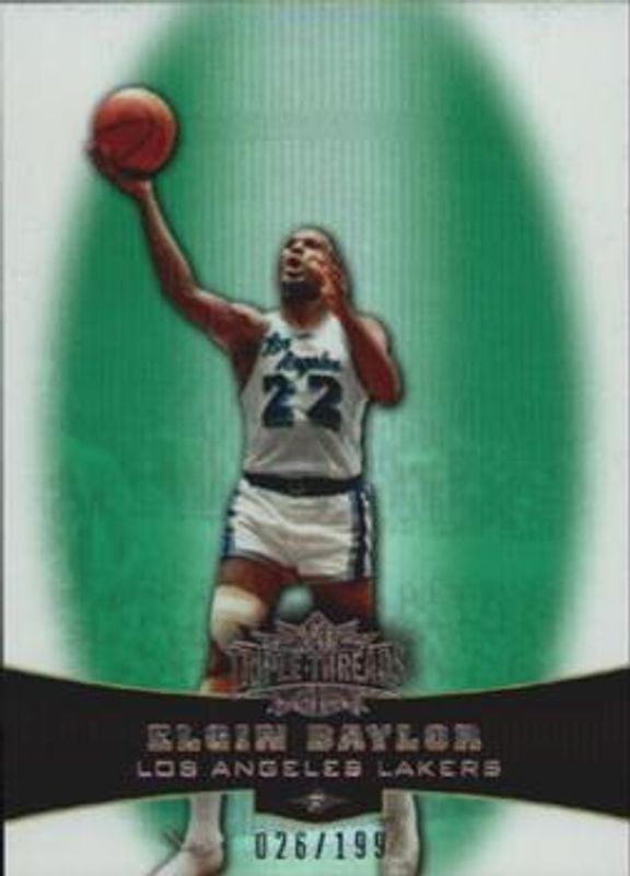 The Elgin Baylor 2006 Topps Triple Threads #95 Emerald /50 card is 1 of 10 Elgin Baylor's card variations in the 2006 Topps Triple Threads set being tracked by Sports Card Investor, including Base /99, Sepia /299, Gold /25, Sapphire /10, and Platinum /1.