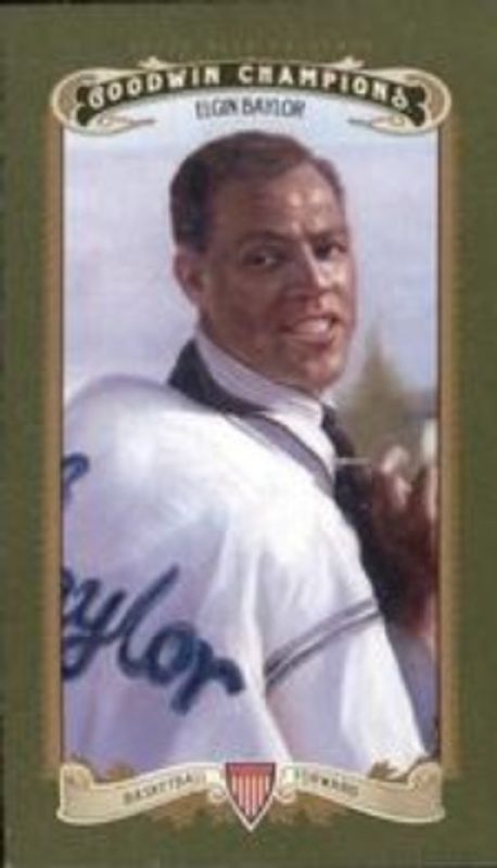 The Elgin Baylor 2012 Upper Deck Goodwin Champions #23 Mini Green card is 1 of 12 Elgin Baylor's card variations in the 2012 Upper Deck Goodwin Champions set being tracked by Sports Card Investor, including Base, Mini, Mini Foil, Mini Green Blank Backs, and Mini Foil Magician Red /12.