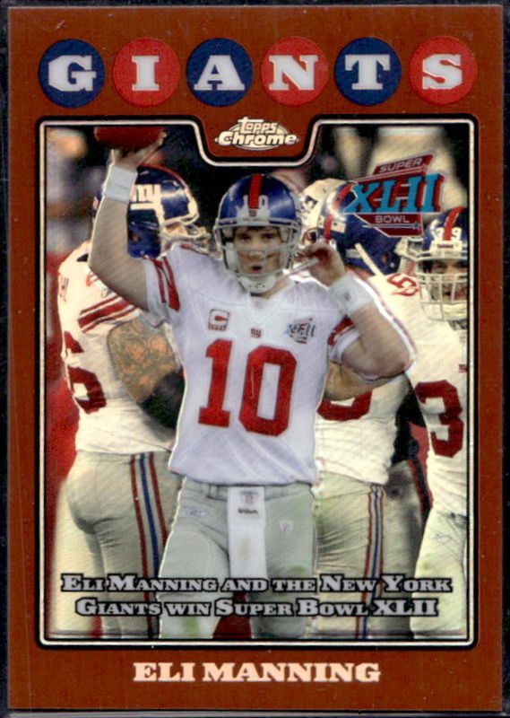 The Eli Manning 2008 Topps Chrome #TC151 Copper Refractor /425 card is 1 of 27 Eli Manning's card variations in the 2008 Topps Chrome set being tracked by Sports Card Investor, including #TC151 Base, #TC13 Base, #TC151 Printing Plates Black /1, #TC13 Printing Plates Black /1, and #TC151 Printing Plates Cyan /1.