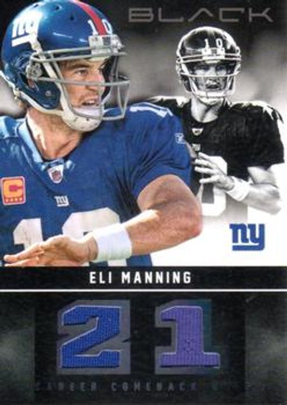 The Eli Manning 2012 Black #4 Stat Line Materials /99 card is 1 of 18 Eli Manning's card variations in the 2012 Black set being tracked by Sports Card Investor, including Base /349, Gold /49, Platinum /25, Black /10, and Printing Plates Black /1.