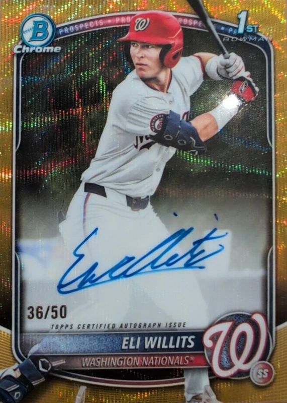 Best Prices Available For Sale of Eli Willits 2025 Bowman Draft #CPA-EW Chrome Prospect Auto - Gold Wave Refractor /50 (1st)