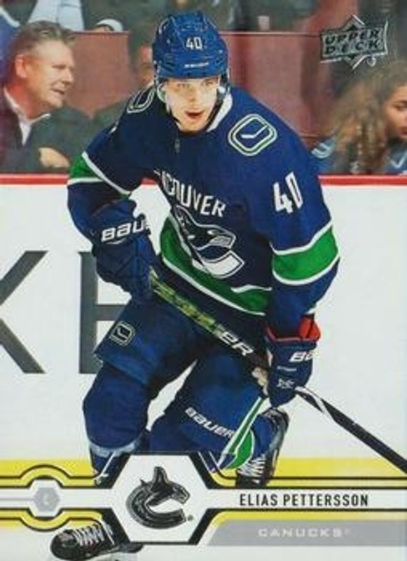 The Elias Pettersson 2019 Upper Deck #168b Base card is 1 of 32 Elias Pettersson's card variations in the 2019 Upper Deck set being tracked by Sports Card Investor, including Base, Clear Cut, UD Exclusives Clear Cut, UD Exclusives /100, and UD High Gloss /10.